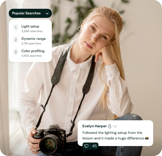 Make every piece of content findable and consumable. Auto-generated transcripts, captions, and AI-powered search across all media mean members actually use what you create and stay engaged.